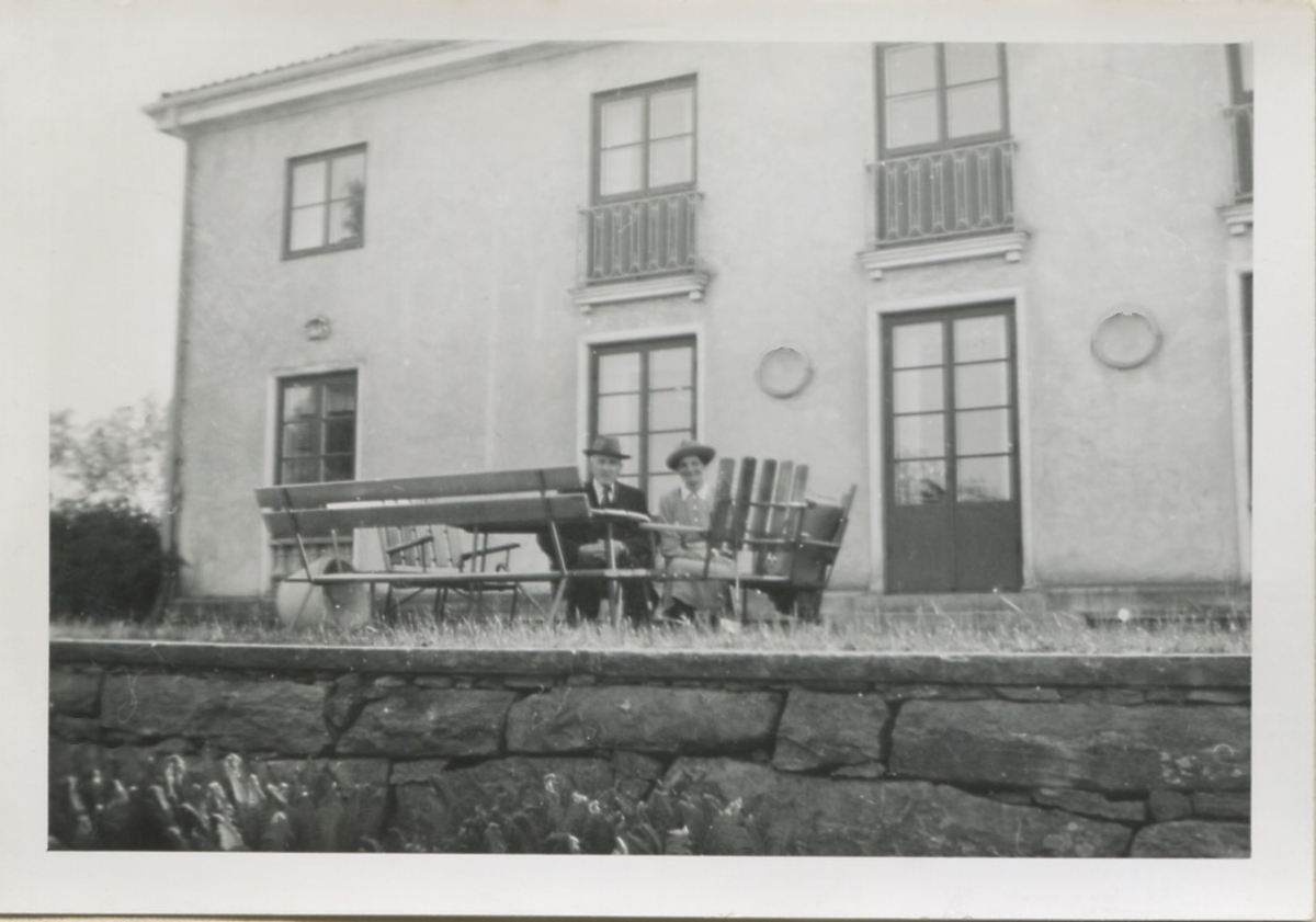 Anders (1873-1951) och Hilda Sandberg (1887-1973) är på utflykt till Rossared herrgård i Halland (Fjärås i Kungsbacka), 1940-tal. Paret sitter i trädgårdsmöbler utanför herrgården. Relaterat motiv: A3679.