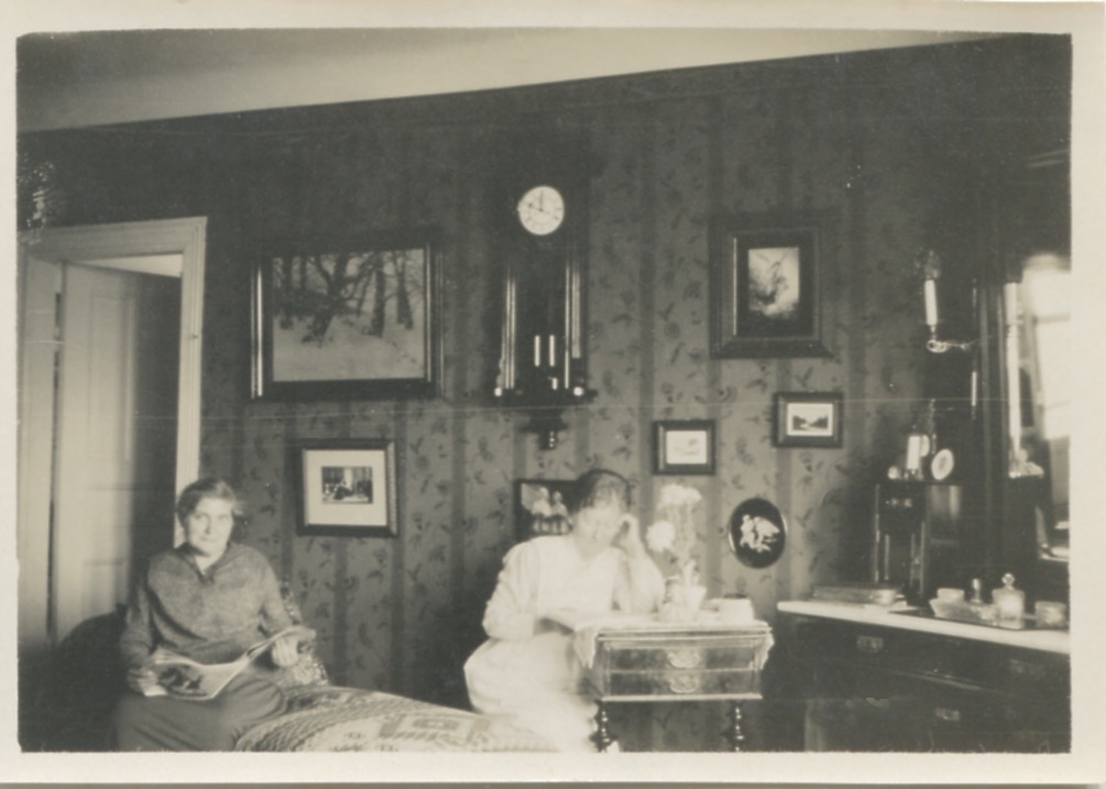 Två kvinnor sitter i ett rum, okänt årtal. Bildtext ur fotoalbum: "Selma och Fru Anna Jönsson på Stretered, Rektorsvillan."