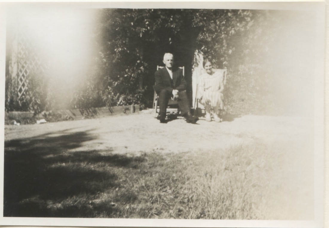 Anders (1873-1951) och Hilda Sandberg (1887-1973, född Olsson) sitter i trädgården nedanför verandan, "Sandbergs" Sagered 3:3 cirka 1950.