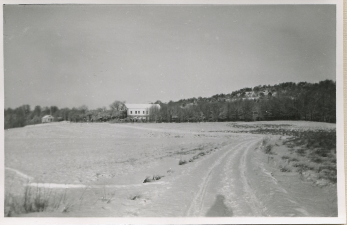 Vy från Streteredsvägen mot Sagereds gård vintern 1954-55. Huset till vänster är "Eklunds" Sagered 3:2. Huset till höger är "Sandbergs" Sagered 3:3.
