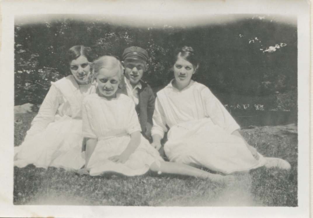 Fyra personer sitter på en gräsmatta, Stretereds skolhem cirka 1920. Från vänster: 1. Hilda Olsson. 2. Irene. 3. Gunnar och 4. Hilda. Hilda Olsson (1887-1973, år 1923 gift Sandberg) arbetade som husa hos Håkan Jönsson som var föreståndare på Stretereds skolhem.