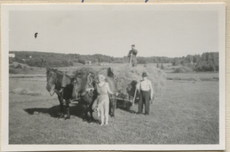 Från vänster: Hilda (1887-1973), Anders (1873-1951) och Robert Sandberg (1880-1961) står på åkern med höskrinda och tre arbetshästar.