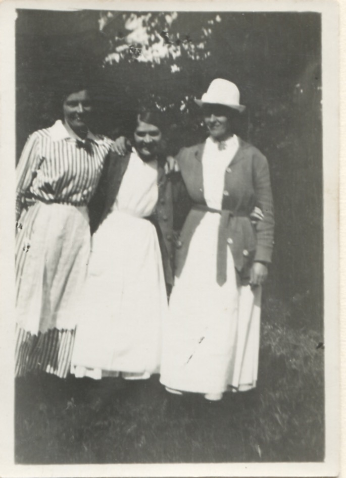 Tre kvinnor står bredvid varandra, Stretered cirka 1918-1923. Bildtext ur fotoalbum "2 Hildor o Klara på Stretered". Kvinnorna arbetade som husor hos rektor Håkan Jönsson som var föreståndare på Stretereds skolhem. En av Hildorna är Hilda Olsson (1887-1973, år 1923 gift Sandberg). Relaterat motiv: A3658.