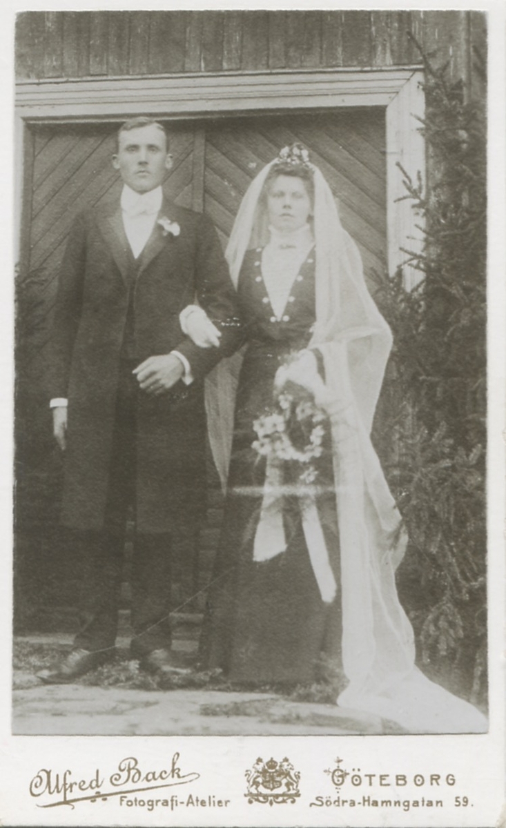 Bröllopsfoto av Karl och Hildur Johansson, Bölet "Viktors" cirka 1910. Familjen bodde i Göteborg på flera olika adresser. Hildur arbetade bland annat hos Viktor Larsson "Viktors" i Bölet. Ibland bodde de hos Larssons i Bölet.