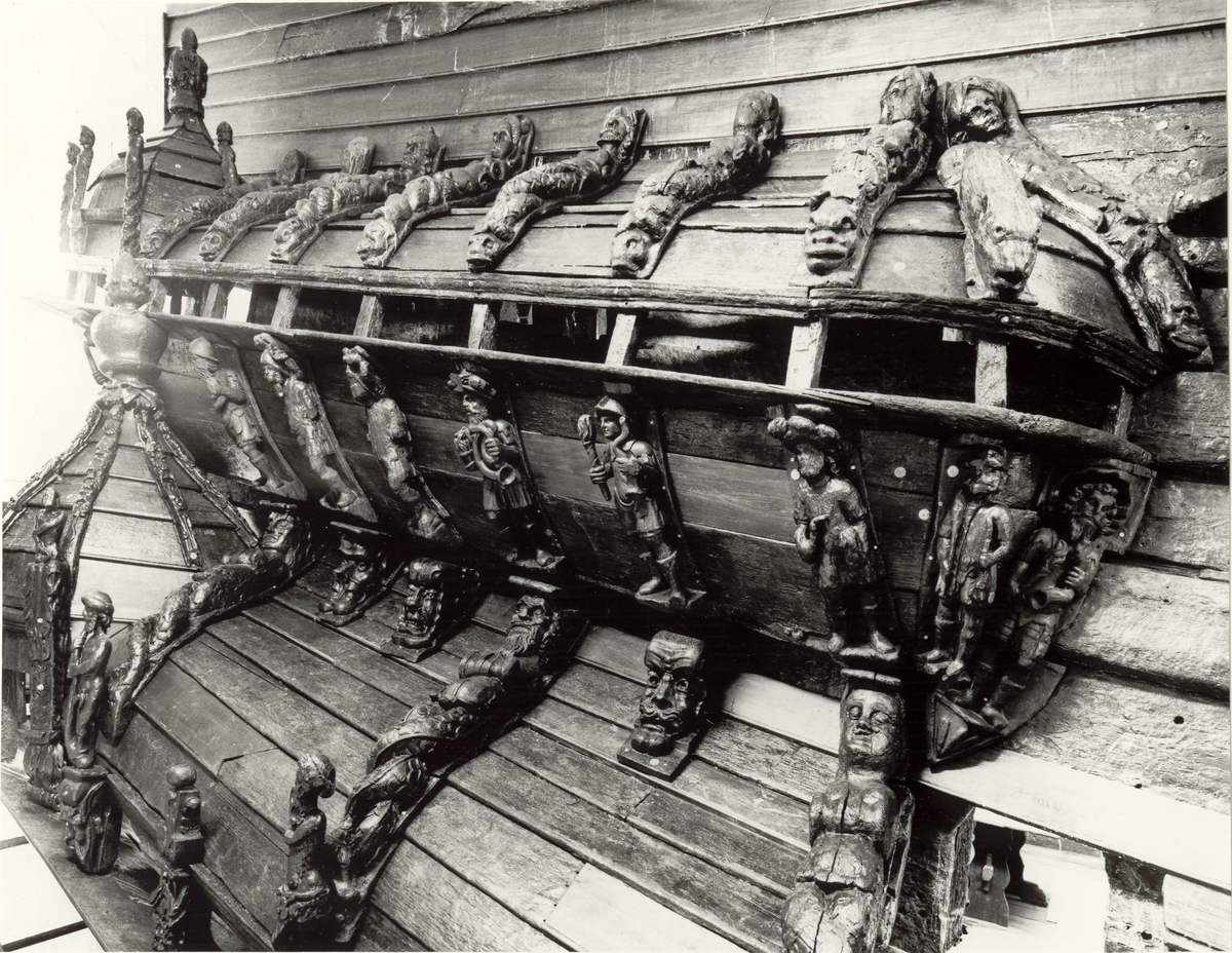 Tritoner och nereider behagfullt utsträckta på regalskeppet Wasas låringsgallerier. Premiär för återplacering av originalskulpturerna på skeppet.