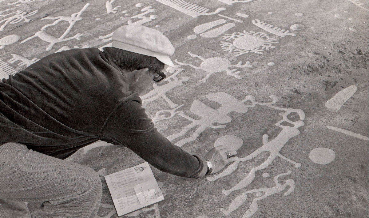 En man som studerar hällristningar. Hällristningsområdet i Tanum är ett område i Tanums kommun i Bohuslän där man funnit flera berghällar med stora mängder hällristningar från bronsåldern. Runt den största av dem, Vitlyckehällen, är Vitlycke museum uppbyggt. Hällen har närmare 300 inhuggna figurer och ca 170 skålgropar. Den kanske mest berömda scenen bland alla Tanums hällristningar, "Brudparet", finns här. Bland de övriga närliggande hällarna märks Litsleby med en ca 2,3 meter lång spjutbeväpnad man, "Spjutguden", och Aspeberget med en plöjningsscen, ett antal oxar och skepp. Hällen vid Fossum ligger en bit från de övriga. Den kännetecknas av en mer sammanhållen och konstnärlig komposition. Kanske är den gjord av en enda ristare.