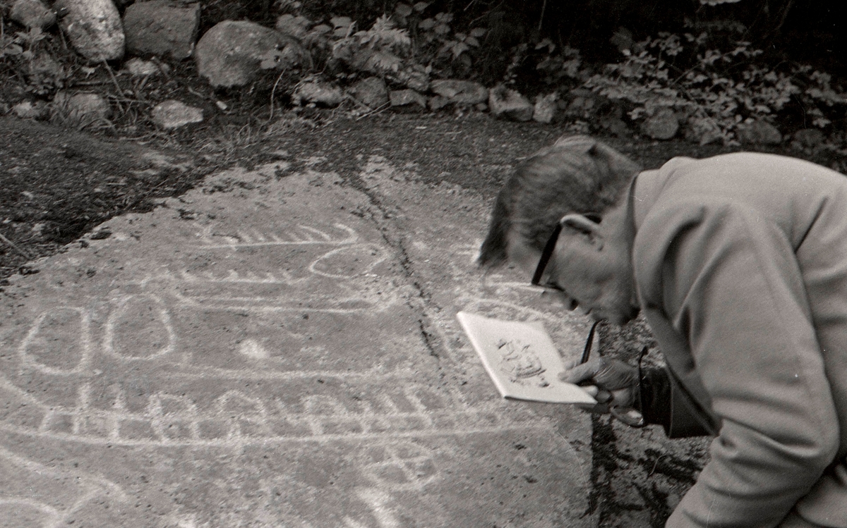 Titel: Bild från Hovåsristningen. En man studerar hällristningar. En hällristning är en samling symboler, figurer och avbildningar som är inhuggna på berghällar eller lösa klippblock under forntiden. Figurerna har som regel aldrig ristats, utan snarare knackats eller huggits in i bergytan med olika typer av knackstenar eller under järnåldern skarpa huggjärn. Hällristningar uppträder i olika kultursammanhang över hela världen. De största koncentrationerna har återfunnits i Afrika, Skandinavien, Sibirien, Nordamerika och Australien. De äldsta funna hällristningarna finns i Afrika och har daterats till mer än 20 000 f. Kr. Av naturliga skäl finns de största hällristningslokalerna där det funnits tillgång på lättbearbetat sten som sandsten. I många fall målade man också på släta bergytor, så kallade hällmålningar. De äldsta fynden har gjorts i grottor där berget inte varit vattenförande och som skyddats från väder och vind och därför kunnat bevaras 10 000-tals år. (Hämtat från Wikipedia)