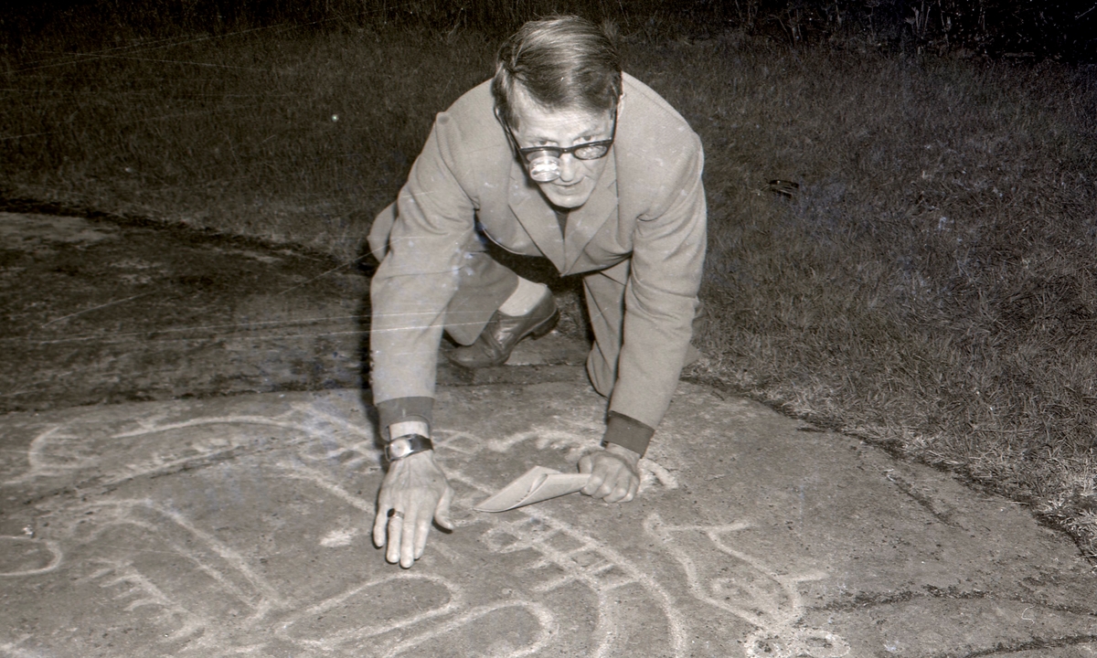 En bild från Hovåsristningen. En man som studerar hällristningar.
