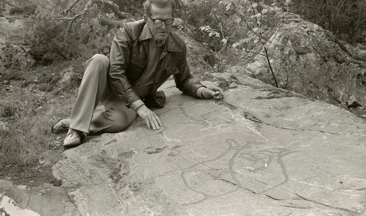Titel: Bild från Hovåsristningen. En man studerar hällristningar. En hällristning är en samling symboler, figurer och avbildningar som är inhuggna på berghällar eller lösa klippblock under forntiden. Figurerna har som regel aldrig ristats, utan snarare knackats eller huggits in i bergytan med olika typer av knackstenar eller under järnåldern skarpa huggjärn. Hällristningar uppträder i olika kultursammanhang över hela världen. De största koncentrationerna har återfunnits i Afrika, Skandinavien, Sibirien, Nordamerika och Australien. De äldsta funna hällristningarna finns i Afrika och har daterats till mer än 20 000 f. Kr. Av naturliga skäl finns de största hällristningslokalerna där det funnits tillgång på lättbearbetat sten som sandsten. I många fall målade man också på släta bergytor, så kallade hällmålningar. De äldsta fynden har gjorts i grottor där berget inte varit vattenförande och som skyddats från väder och vind och därför kunnat bevaras 10 000-tals år. (Hämtat från Wikipedia)