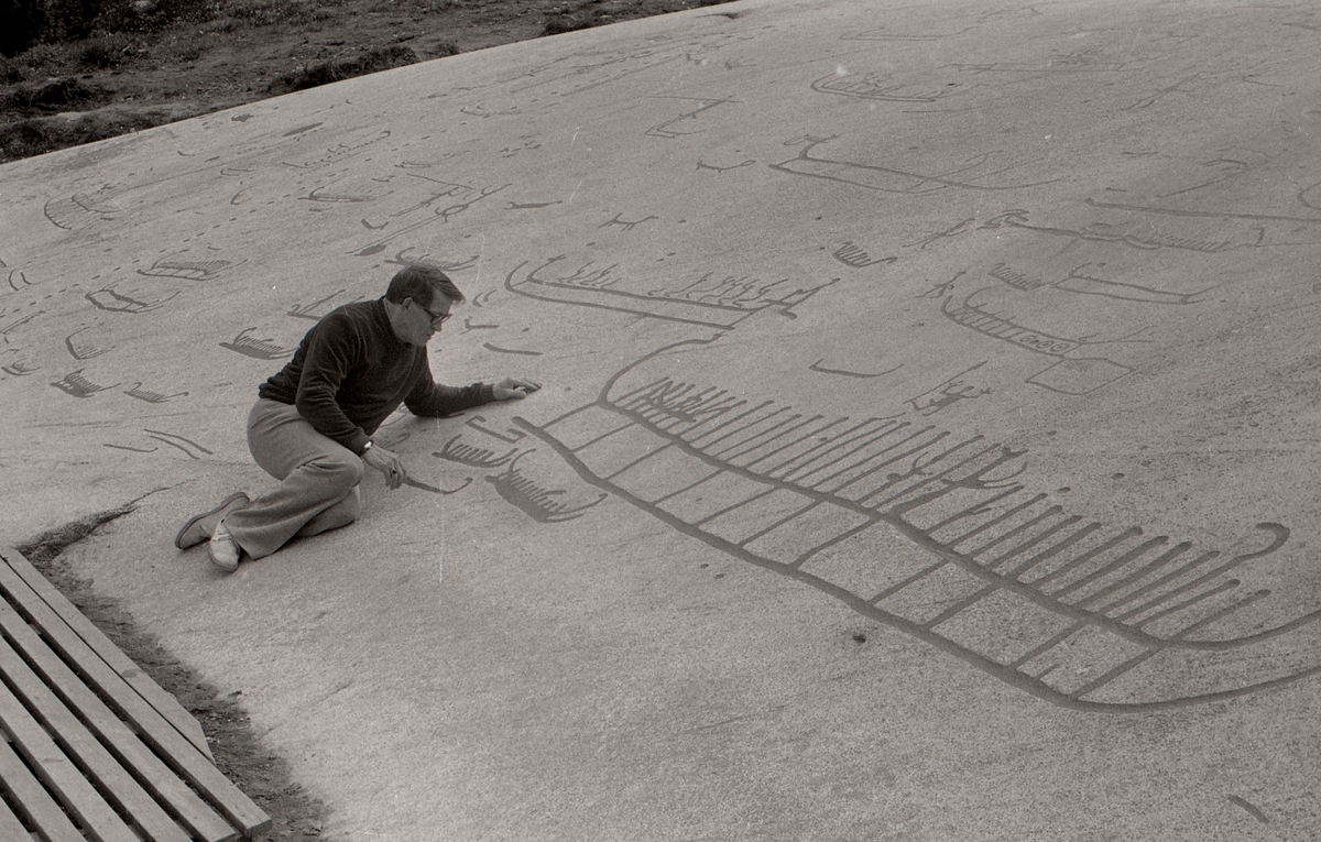 Hällristningar av bland annat fartyg, en man studerar desssa. Hällristningsområdet i Tanum är ett område i Tanums kommun i Bohuslän där man funnit flera berghällar med stora mängder hällristningar från bronsåldern. Runt den största av dem, Vitlyckehällen, är Vitlycke museum uppbyggt. Hällen har närmare 300 inhuggna figurer och ca 170 skålgropar. Den kanske mest berömda scenen bland alla Tanums hällristningar, "Brudparet", finns här. Bland de övriga närliggande hällarna märks Litsleby med en ca 2,3 meter lång spjutbeväpnad man, "Spjutguden", och Aspeberget med en plöjningsscen, ett antal oxar och skepp. Hällen vid Fossum ligger en bit från de övriga. Den kännetecknas av en mer sammanhållen och konstnärlig komposition. Kanske är den gjord av en enda ristare.