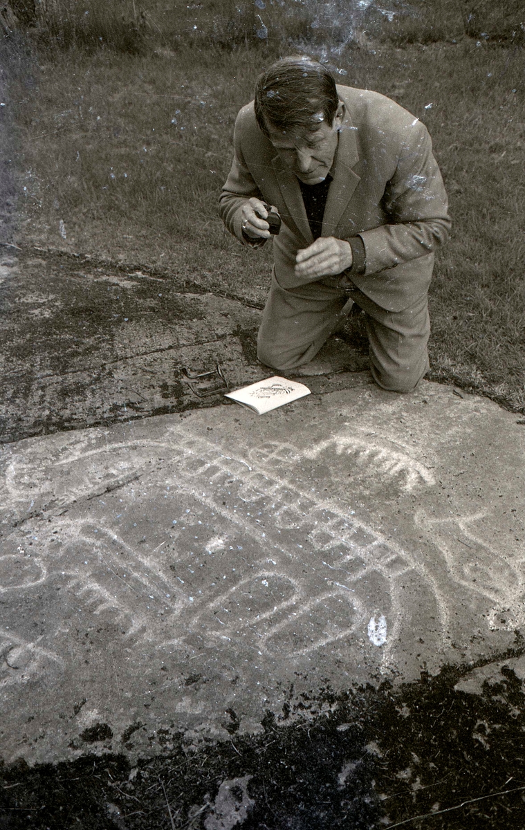 Titel: Bild från Hovåsristningen. En man studerar hällristningar. En hällristning är en samling symboler, figurer och avbildningar som är inhuggna på berghällar eller lösa klippblock under forntiden. Figurerna har som regel aldrig ristats, utan snarare knackats eller huggits in i bergytan med olika typer av knackstenar eller under järnåldern skarpa huggjärn. Hällristningar uppträder i olika kultursammanhang över hela världen. De största koncentrationerna har återfunnits i Afrika, Skandinavien, Sibirien, Nordamerika och Australien. De äldsta funna hällristningarna finns i Afrika och har daterats till mer än 20 000 f. Kr. Av naturliga skäl finns de största hällristningslokalerna där det funnits tillgång på lättbearbetat sten som sandsten. I många fall målade man också på släta bergytor, så kallade hällmålningar. De äldsta fynden har gjorts i grottor där berget inte varit vattenförande och som skyddats från väder och vind och därför kunnat bevaras 10 000-tals år. (Hämtat från Wikipedia)