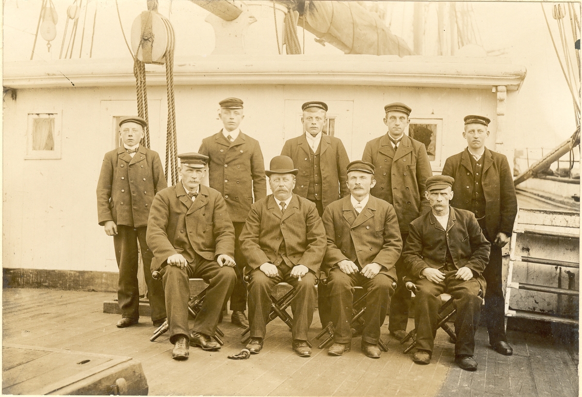 Fr.v nedre raden: Styrman Holm, Löfgren, båtsman Axel Gustafsson, Sjöberg?