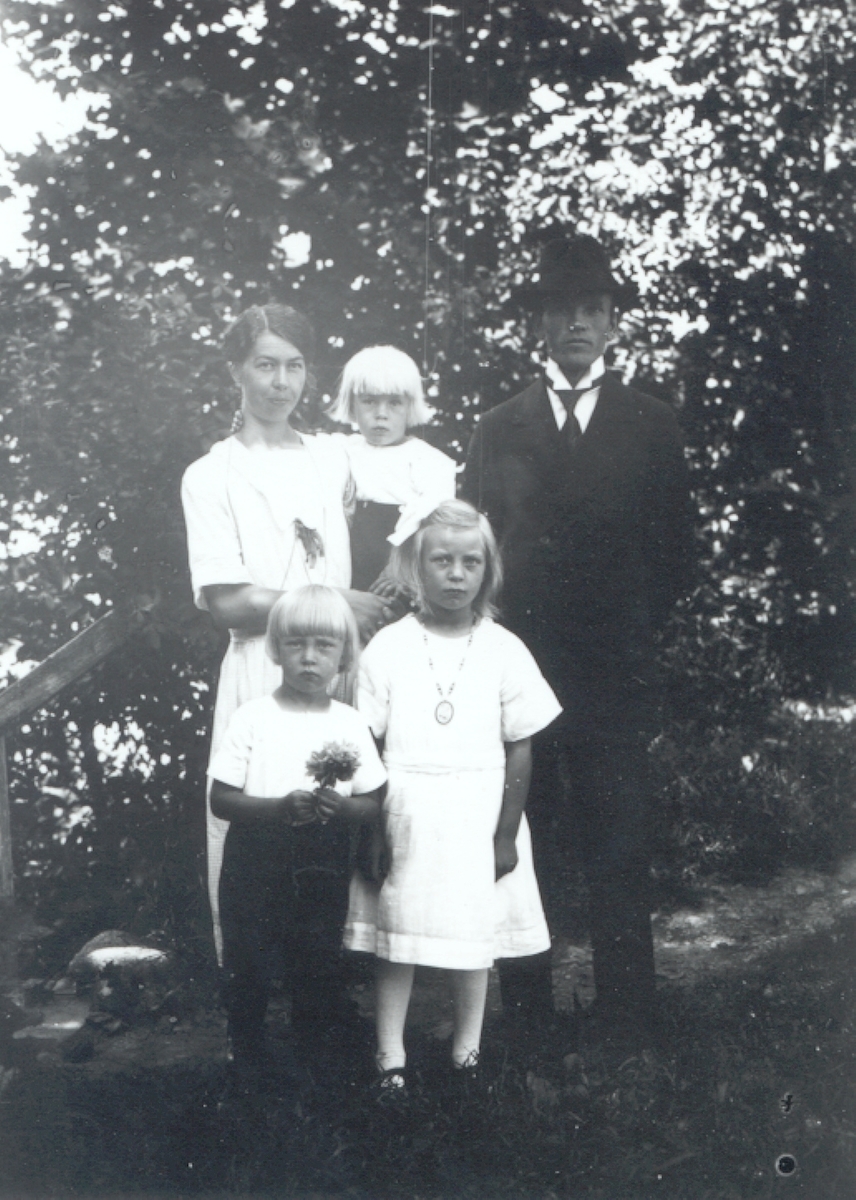 Familjen Emil Svensson, Karlsborg, Mörtfors. Elsa Svensson, född Johansson med sonen Bertil på armen samt maken Emil Svensson. Stående framför Karl-Elon och Lilly.