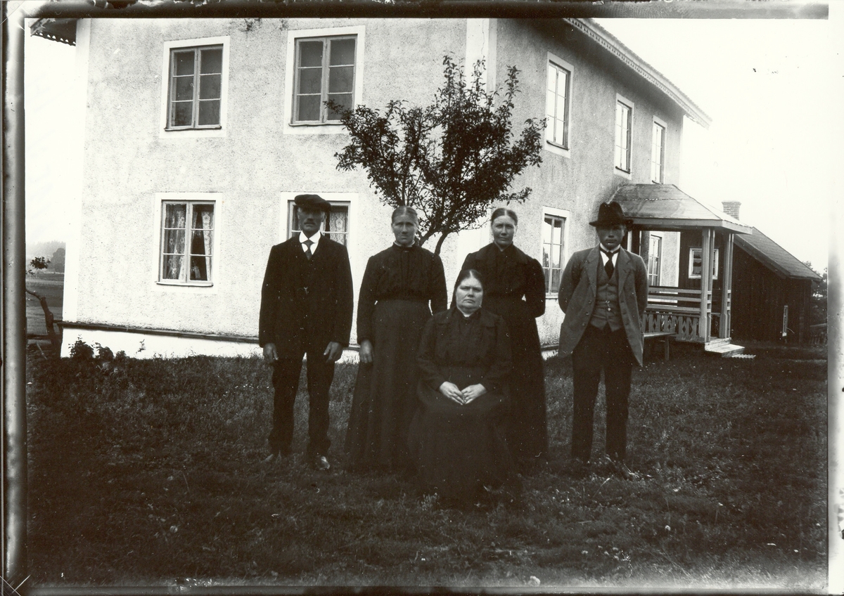 Gunnar med sin familj utanför sitt hem i Getterum, Hjorteds socken.