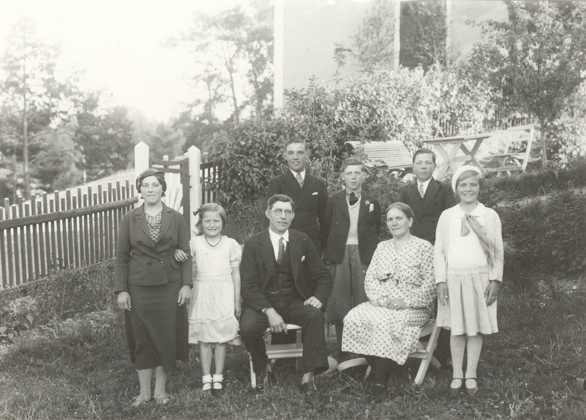 Makarna Ottilia och Josef Karlsson med sina sex barn, samtliga tillhörde Mörtfors Baptistförsamling. I bakgrunden: Elimkyrkan.