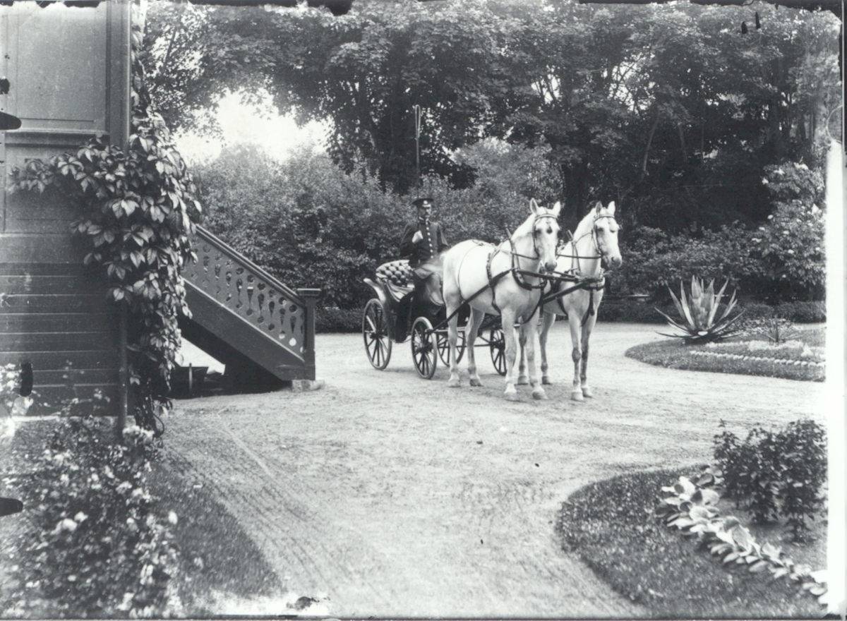 Landå med kusk och vita parhästar i Falsterbo, tidigt 1900-tal.