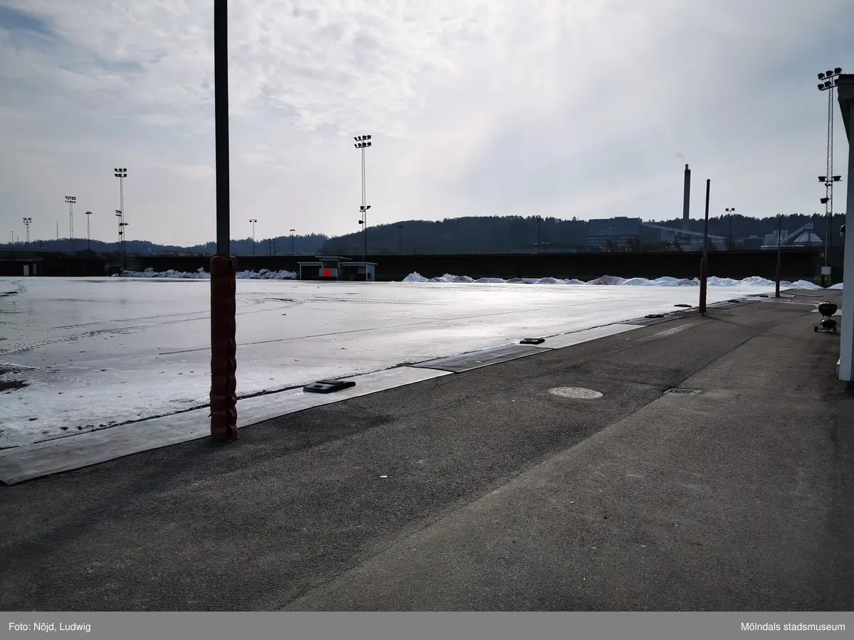 Åby isstadion/Åby bandybana med adress Idrottsvägen 5 i Åby, Mölndal. Fastighetsbeteckning är Hälsan 2. Vy mot sydost. Fotografi taget den 15 mars 2022. Byggnadsdokumentation inför rivning.