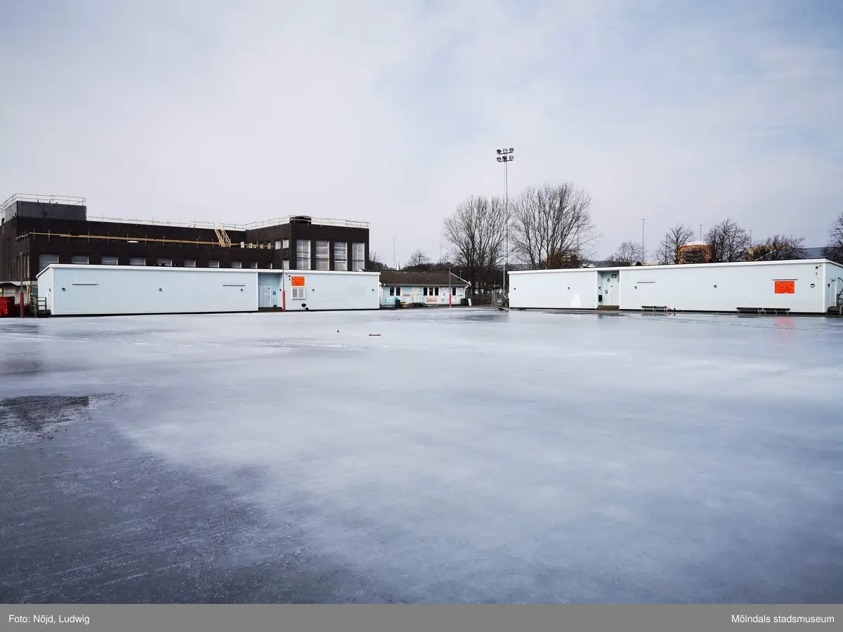 Åby isstadion/Åby bandybana med adress Idrottsvägen 5 i Åby, Mölndal. Fastighetsbeteckning är Hälsan 2. Vy mot nordväst. Fotografi taget den 15 mars 2022. Byggnadsdokumentation inför rivning.