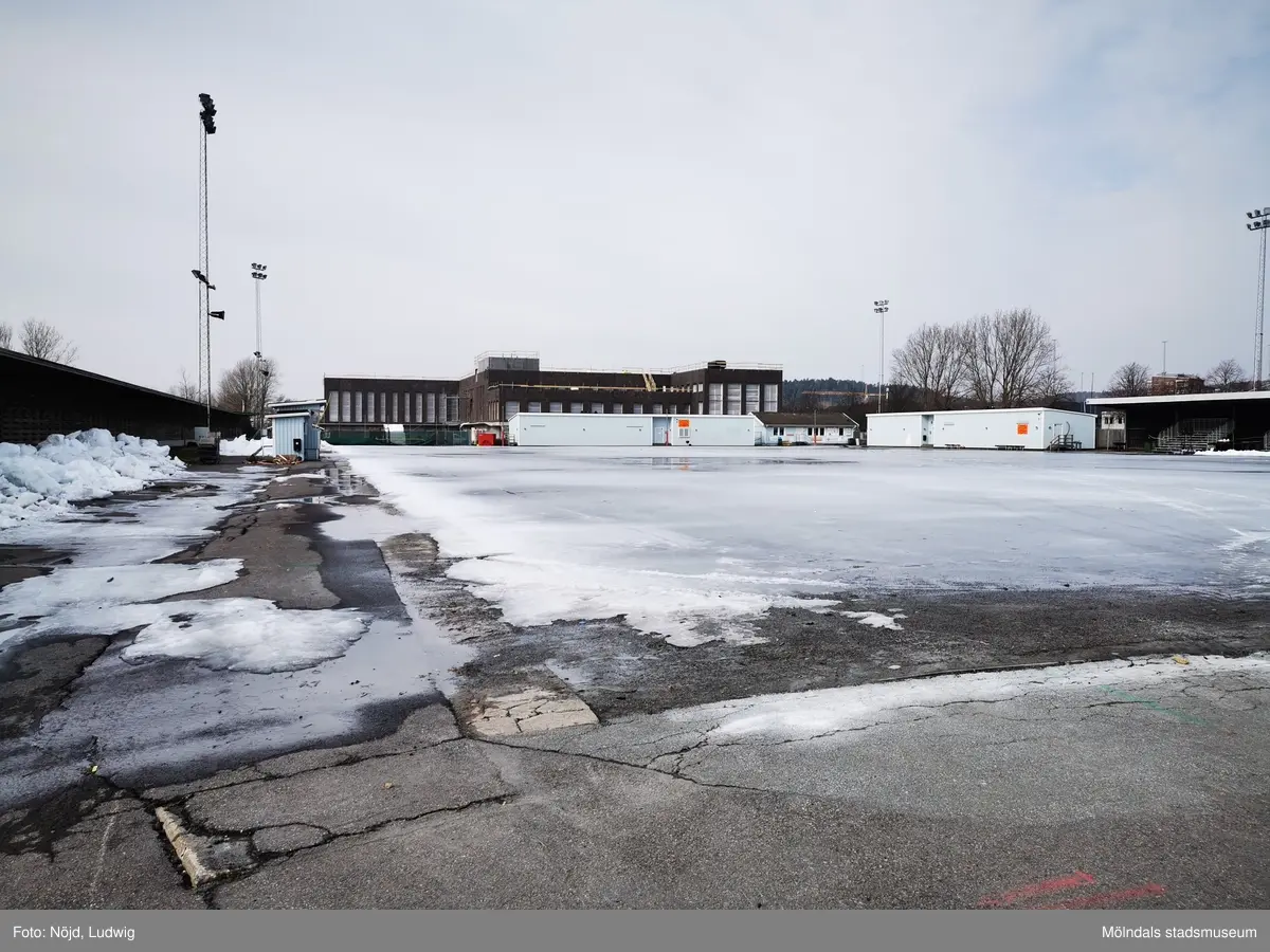 Åby isstadion/Åby bandybana med adress Idrottsvägen 5 i Åby, Mölndal. Fastighetsbeteckning är Hälsan 2. Vy mot nordväst. Fotografi taget den 15 mars 2022. Byggnadsdokumentation inför rivning.