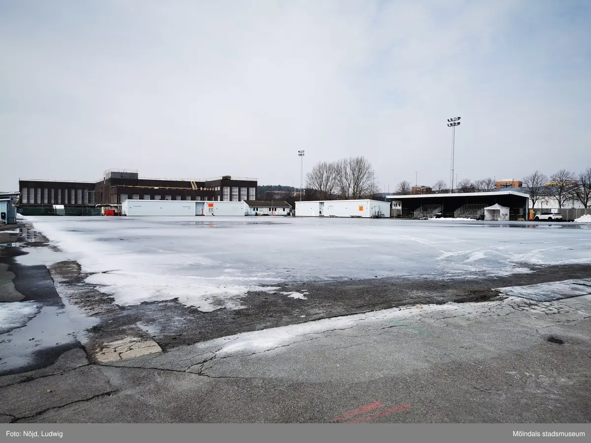Åby isstadion/Åby bandybana med adress Idrottsvägen 5 i Åby, Mölndal. Fastighetsbeteckning är Hälsan 2. Vy mot nordväst. Fotografi taget den 15 mars 2022. Byggnadsdokumentation inför rivning.