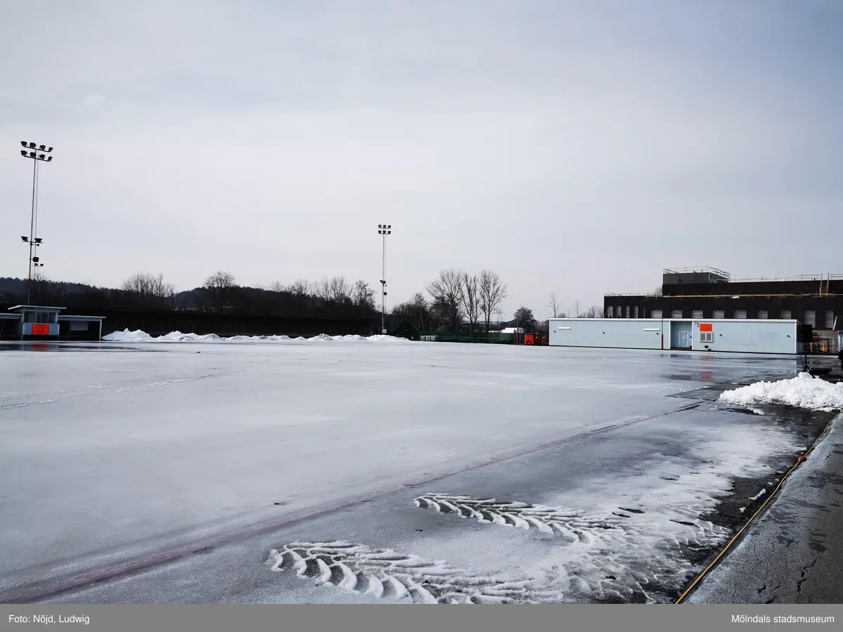Åby isstadion/Åby bandybana med adress Idrottsvägen 5 i Åby, Mölndal. Fastighetsbeteckning är Hälsan 2. Vy mot väster. Fotografi taget den 15 mars 2022. Byggnadsdokumentation inför rivning.