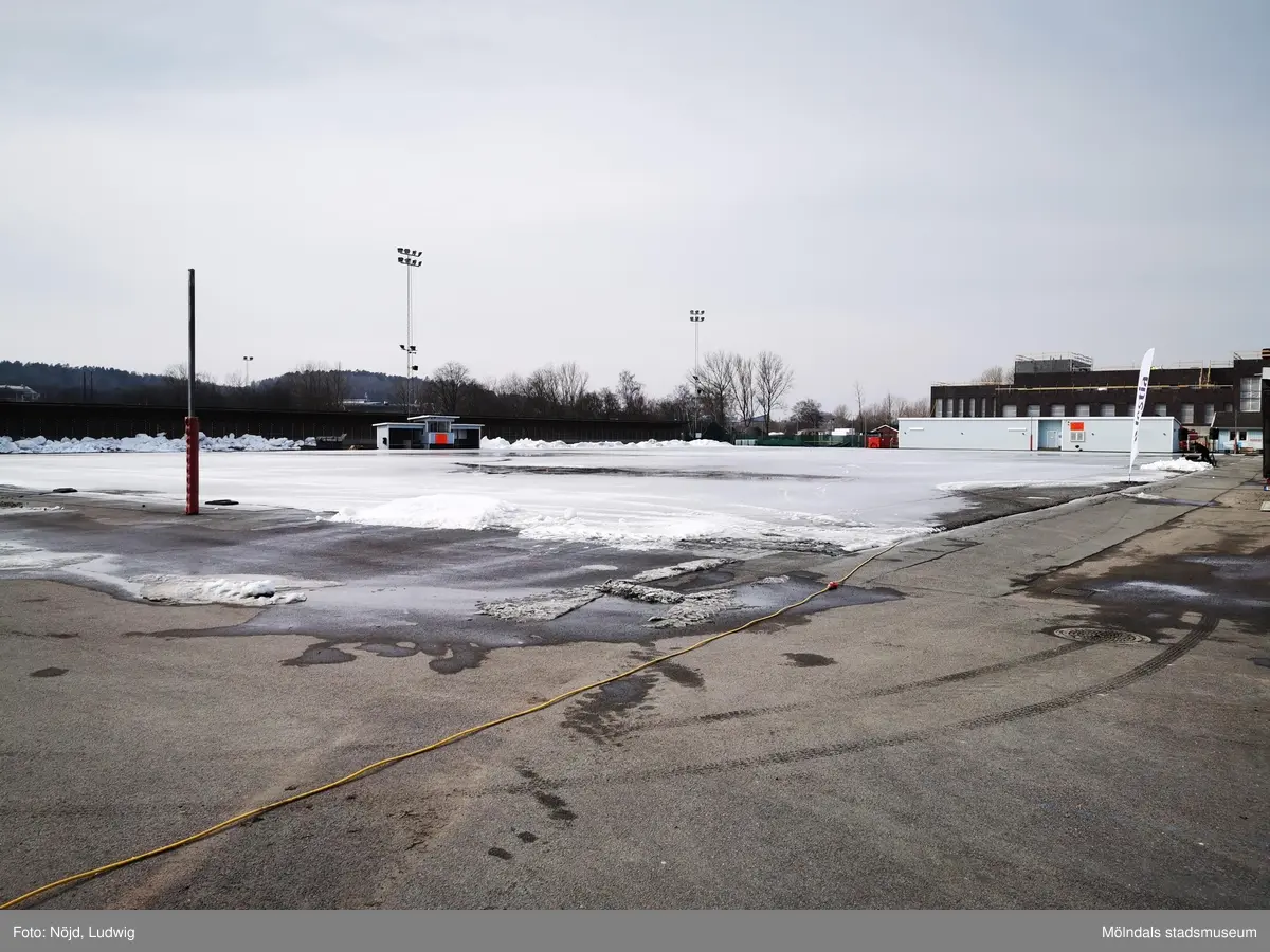 Åby isstadion/Åby bandybana med adress Idrottsvägen 5 i Åby, Mölndal. Fastighetsbeteckning är Hälsan 2. Vy mot sydväst. Fotografi taget den 15 mars 2022. Byggnadsdokumentation inför rivning.