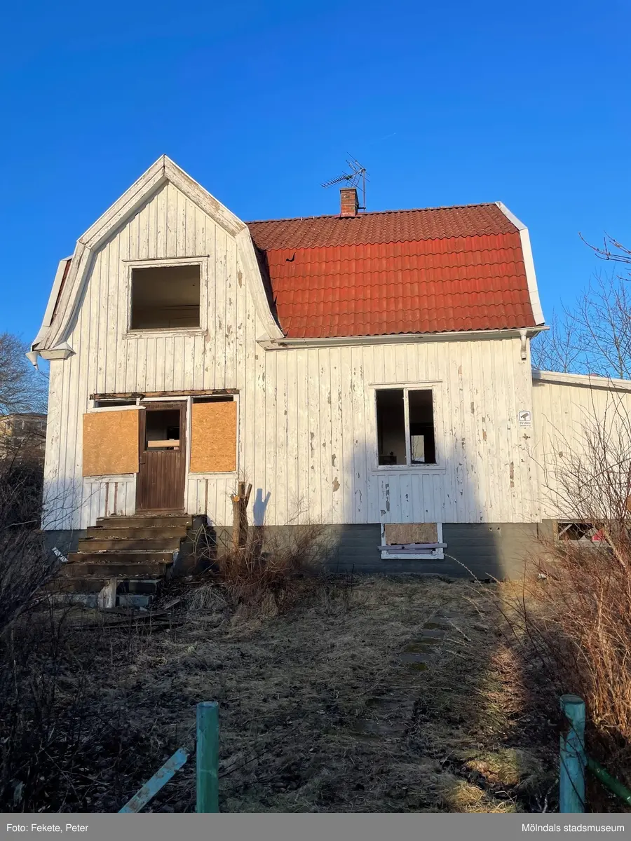 Titel: Vitmålat bostadshus med adress Lindåsvägen 5 i Gastorp, Lindome, i Mölndals kommun. Fastigheten har beteckningen Gastorp 2:72. Fotografi taget den 28 februari 2022. Byggnadsdokumentation inför rivning. Den 26 oktober 1990 begicks mordet på 89-årige Ernst Olsson i huset. Två personer greps, som skyllde på varandra. Eftersom domstolen inte kunde avgöra vem som talade sanning, gick båda fria från själva mordåtalet, men de dömdes för bland annat grov stöld. Mordet med efterföljande rättegångar blev allmänt känt som Lindomefallet. För fall där gärningsmännen skyller på varandra och därigenom får mildare domar, har Lindomefallet blivit ett juridiskt begrepp.