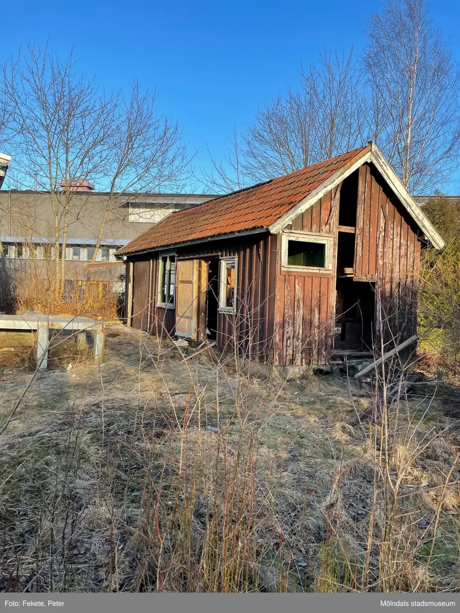 Rödmålad ekonomibyggnad på adressen Lindåsvägen 5 i Gastorp, Lindome, i Mölndals kommun. Fastigheten har beteckningen Gastorp 2:72. Fotografi taget den 28 februari 2022. Byggnadsdokumentation inför rivning.