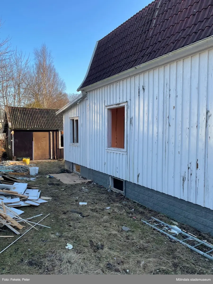 Bostadshus med tillhörande ekonomibyggnad på adressen Lindåsvägen 5 i Gastorp, Lindome, i Mölndals kommun. Fastigheten har beteckningen Gastorp 2:72. Fotografi taget den 28 februari 2022. Byggnadsdokumentation inför rivning.