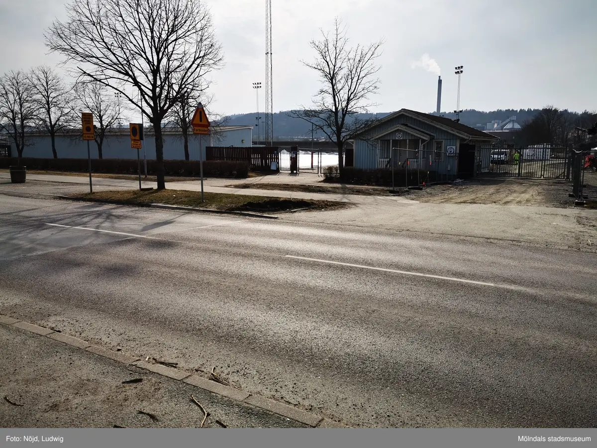 Vy söderut över Idrottsvägen mot Åby isstadion/Åby bandybana med adress Idrottsvägen 5 i Åby, Mölndal. Fastighetsbeteckning är Hälsan 2. Fotografi taget den 15 mars 2022. Byggnadsdokumentation inför rivning.