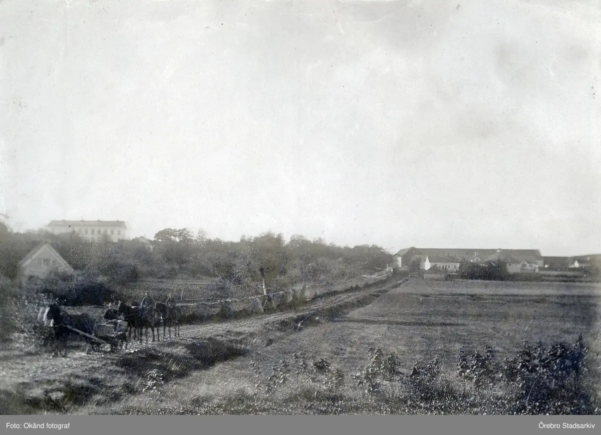Hästdragen kärra på väg mot stallet och ladugården på Karlslunds gård, 1910-tal