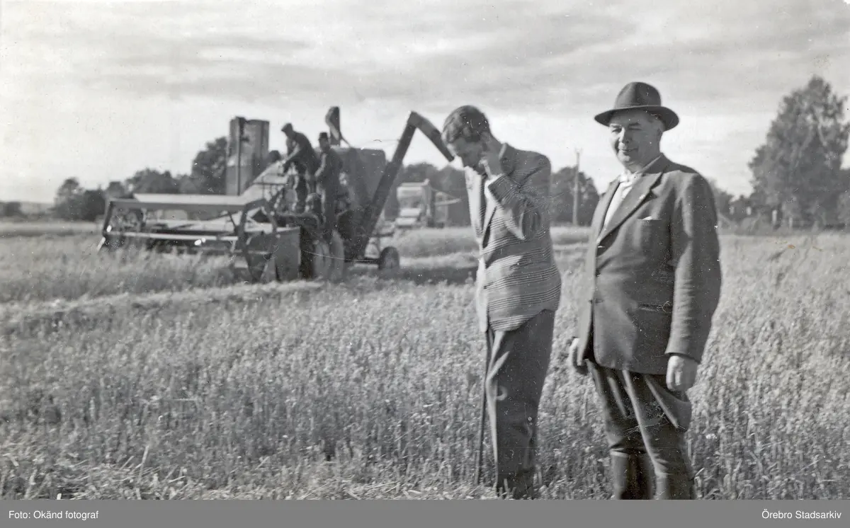 Fabian Wrede och inspektor Lorentz Forsberg inspekterar skördetröska på Karlslunds gård, 1940-tal