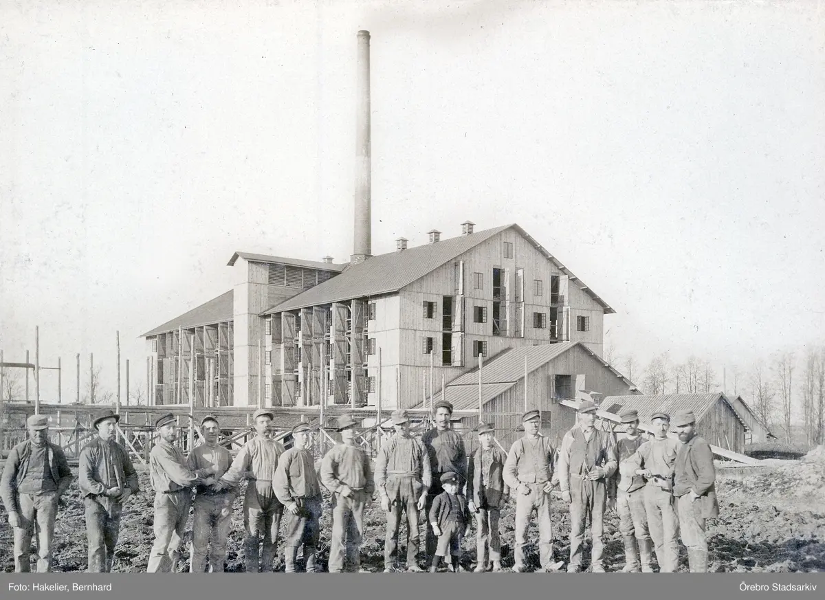 Byggarbetare framför Åby tegelbruket under dess byggnation, 1890-tal