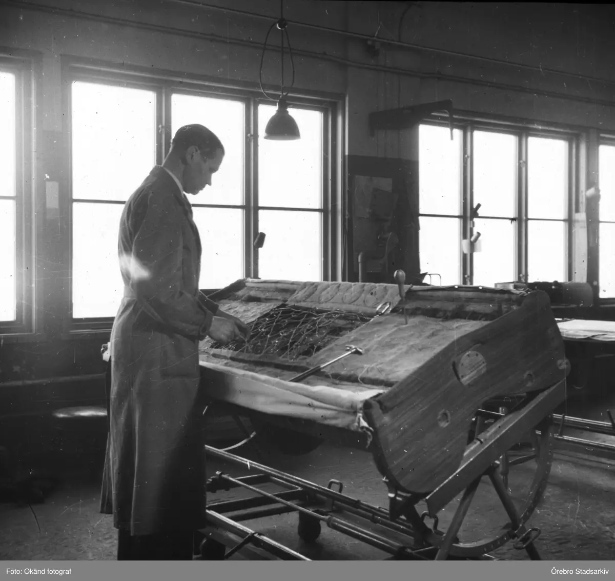 En soffa stoppas på tapetseriavdelningen i vagnverkstaden, 1902-1909