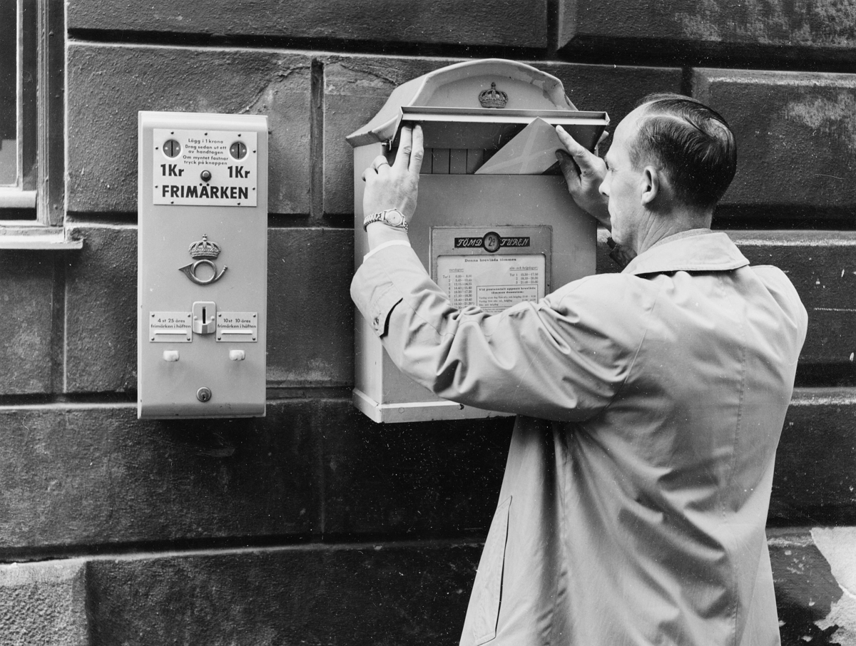 Modern frimärksautomat för frimärkshäften och brevlåda på fasaden