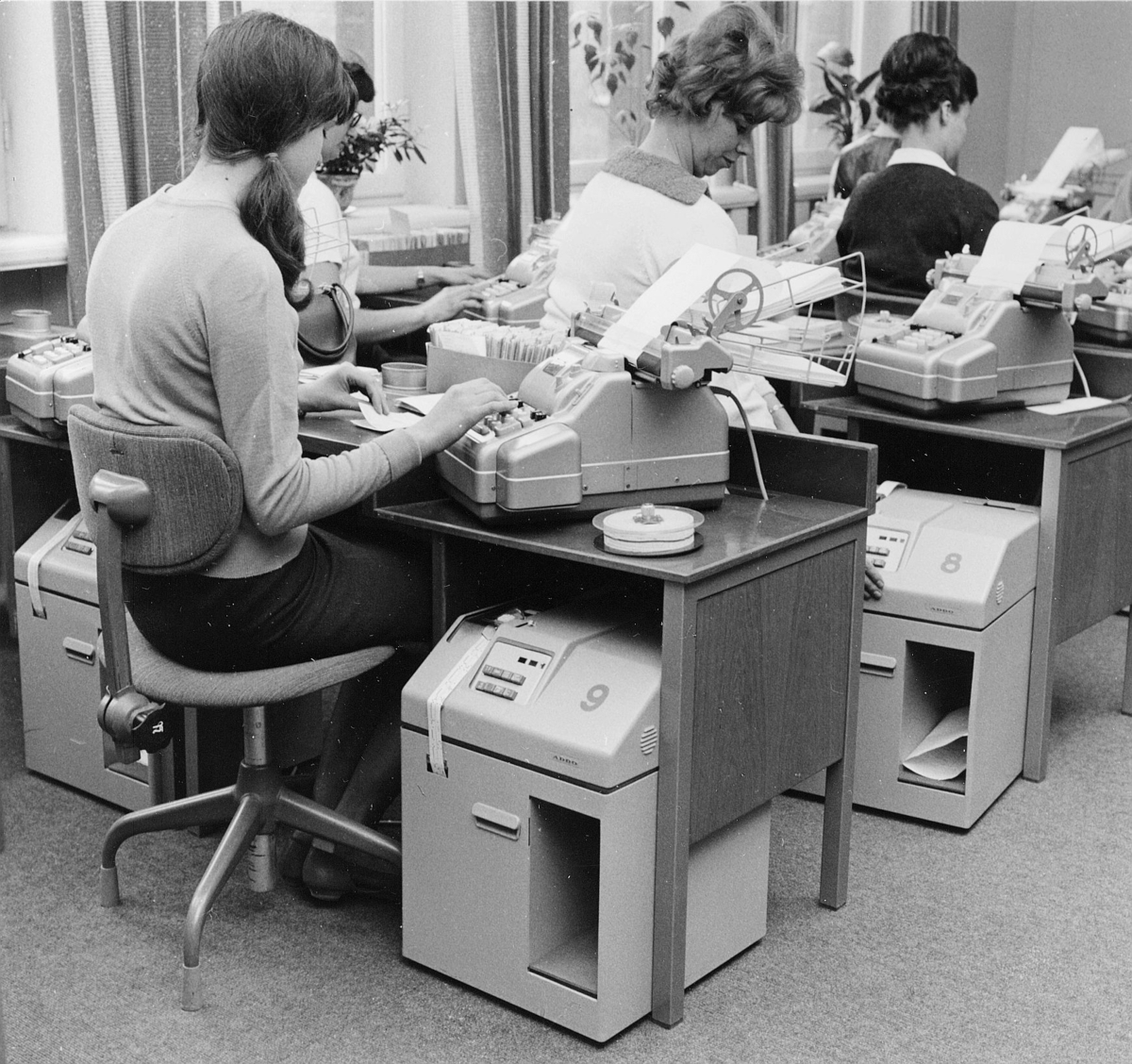 Girobokföringen. Slagning av utbetalningskort: man får dels en journal, dels en hålremsa. Addo bokföringsmaskin.