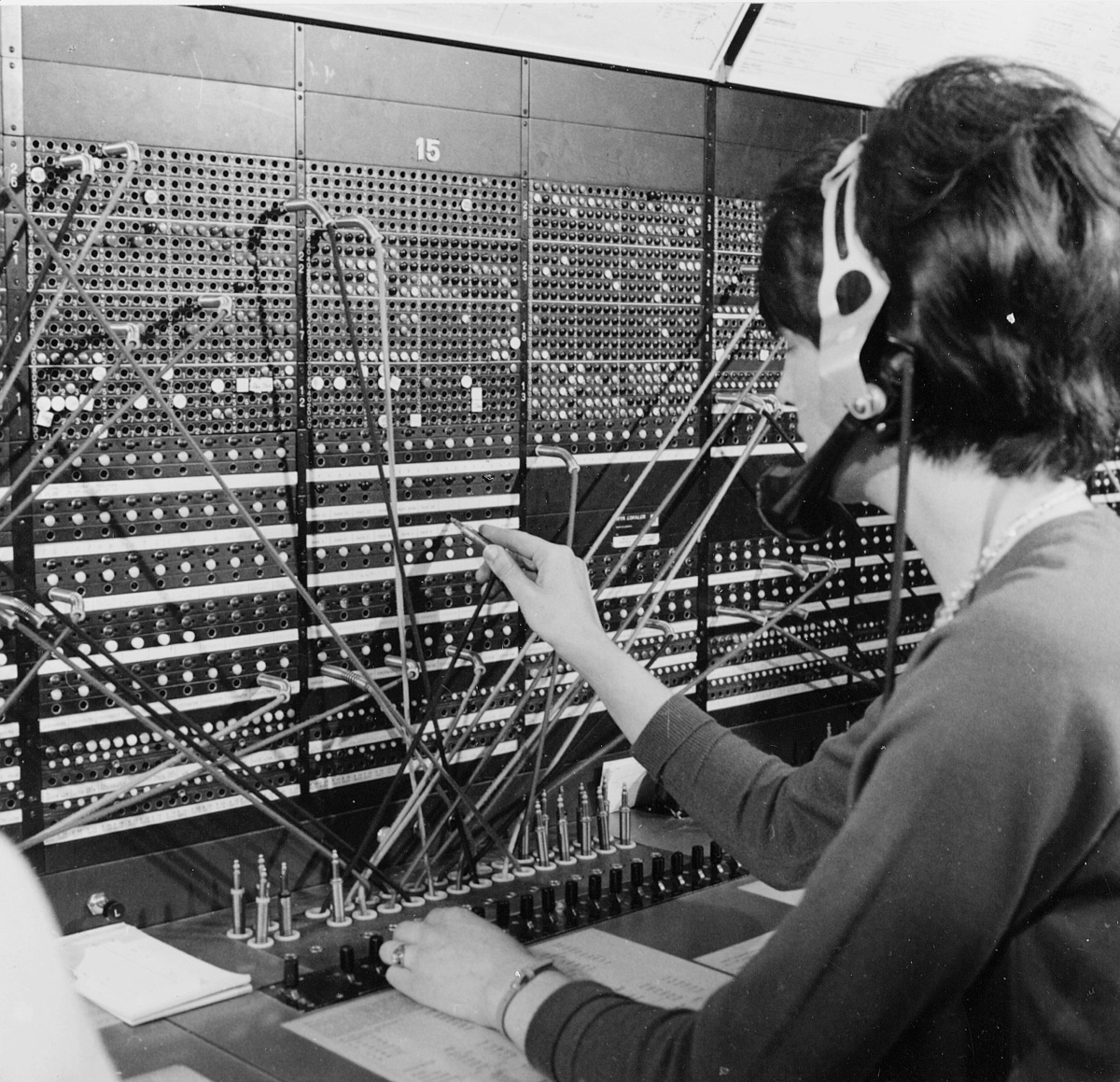 Centralposthusets telefonväxel, belägen i våningen 1 trappa, med entrén från Mäster Samuelsgatan 64. Växeln betjänas av ett stort antal damer som bl a kopplar samtal till postgirot.