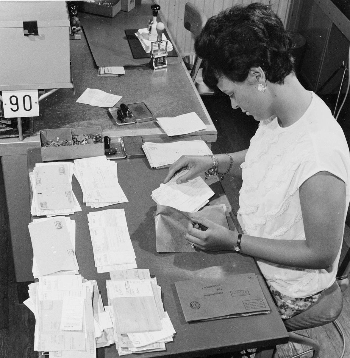 Girobokföringen. Postöppning, sortering av bruna kuvertets innehåll.