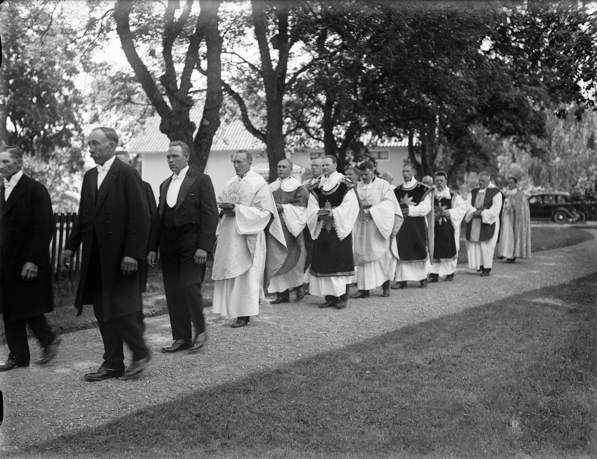 Titel: "Kyrklig högtid i Ekeby på söndagen. Ärkebiskop Eidem installerar nye kyrkoherden", Uppland 1935