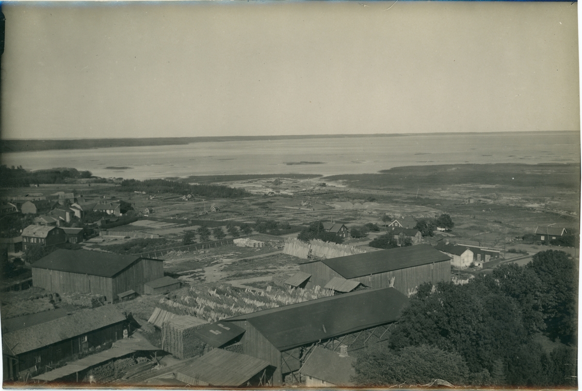 Vänersborg. Vy över Vänersborgsviken, tändsticksfabrikens virkesförråd och Sjöberget