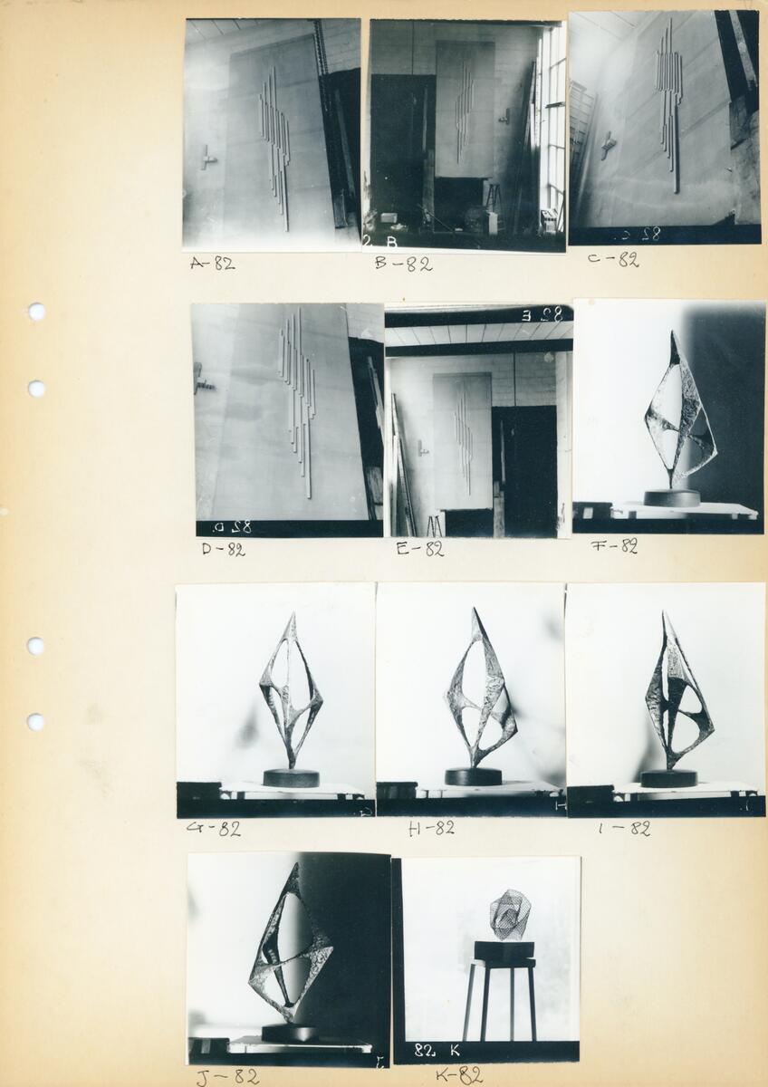 5 bilder av en fasadrelief, Vertikal rotation, 5 bilder av skulpturen Treklang, 1 bild okänd