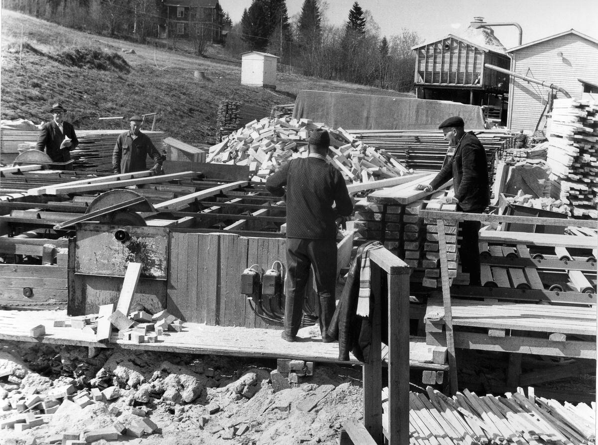 Sågverket. Ett arbetslag i verksamhet vid ett sågband.