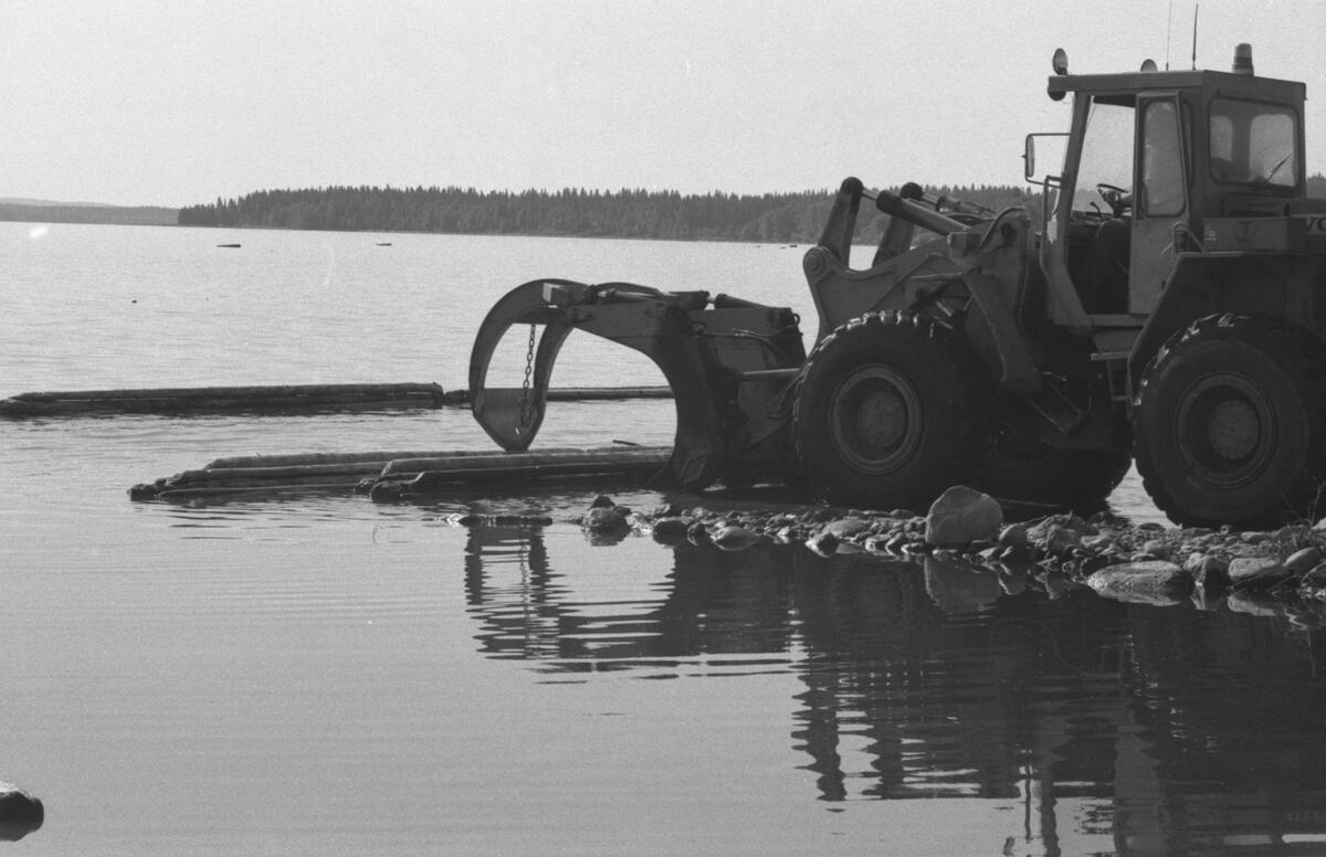 Bäckmyrviken. Baklastaren tar upp fraktbommar. Rune Österlund kör.