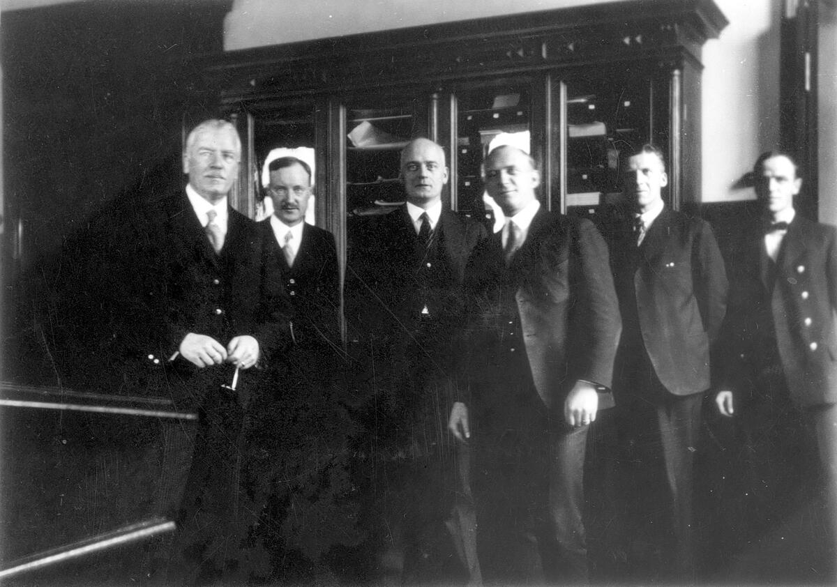 Titel: Bankpersonal. Från vänster: Ragnar Forsman, direktör. Magnus Nordström. Bengt Kron, registrator. Nils Möller, kammarskrivare. Hjalmar Olsson, kassör. Verner Hägglund, vaktmästare.