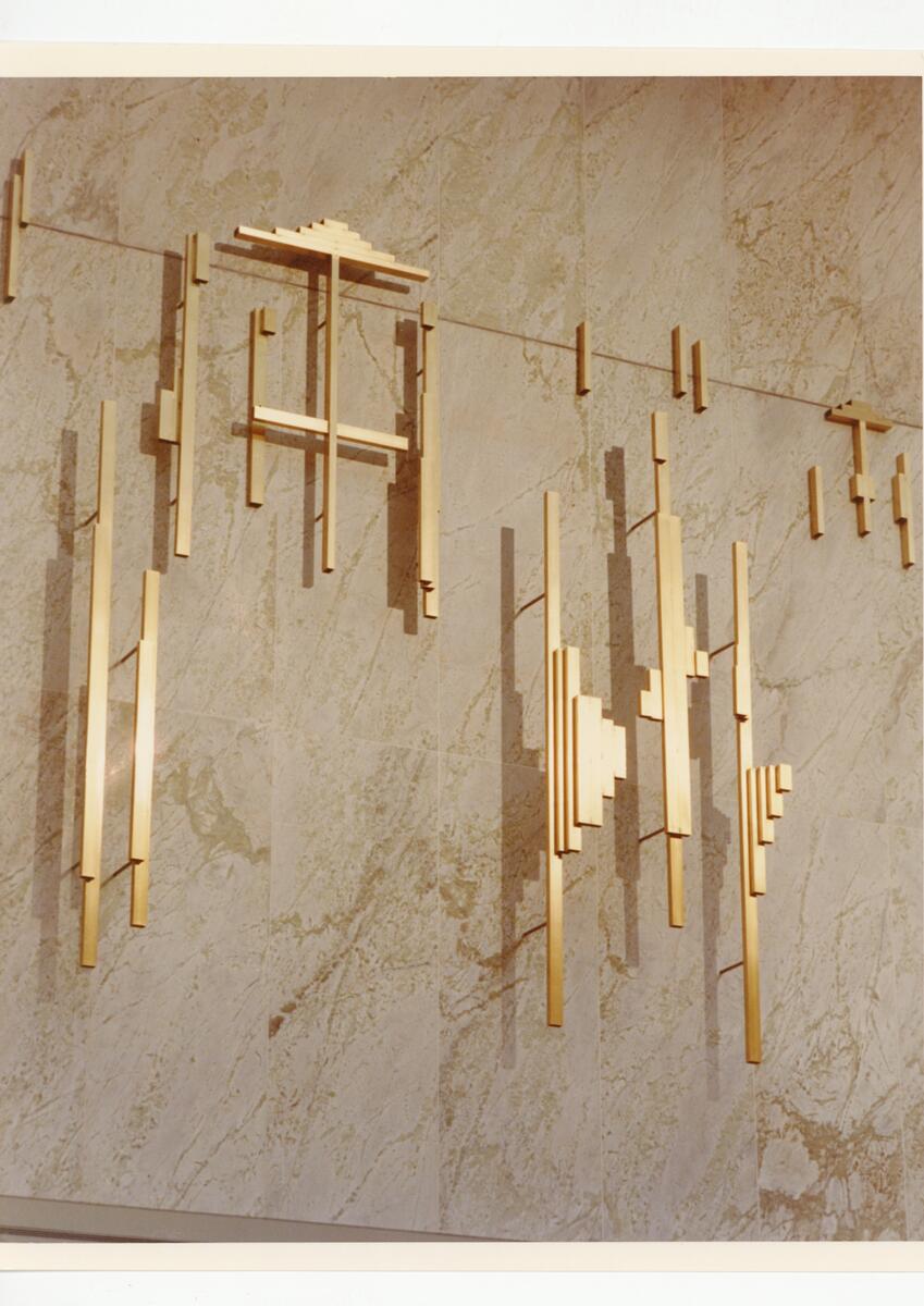 En bild av en relief, av mässing och mahogny, Torget. SE banken, Malmö.;