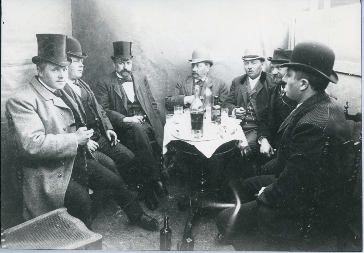 Män som sitter och dricker öl på okänd uteservering i Västerås, c:a 1900.