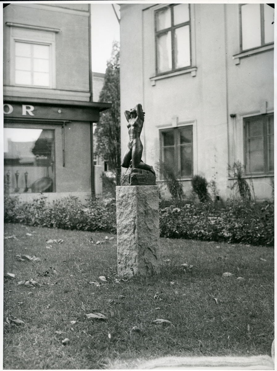 Skupturen "Eva" utanför Västerås Konstförenings lokal, Stora gatan 44. 1930-talet.