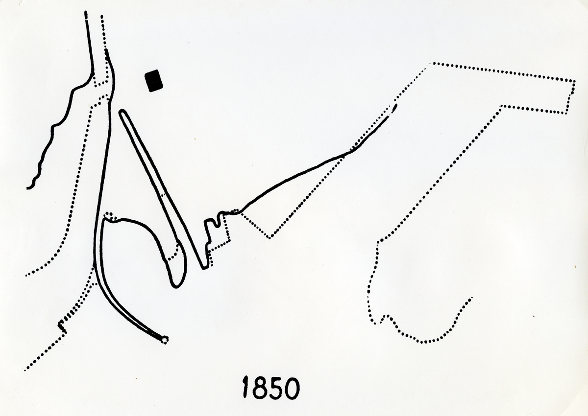 Kartritning med text: "1850 kompletteras Ångbåtshamnen i Västerås med vågbrytare".
