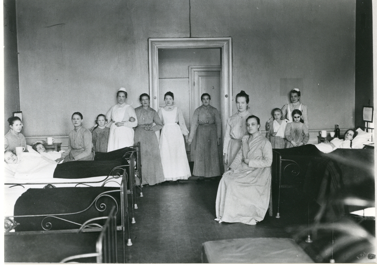 Interiör av sjuksal med patienter tillsammans med sjuksystrar. 1920-talet.