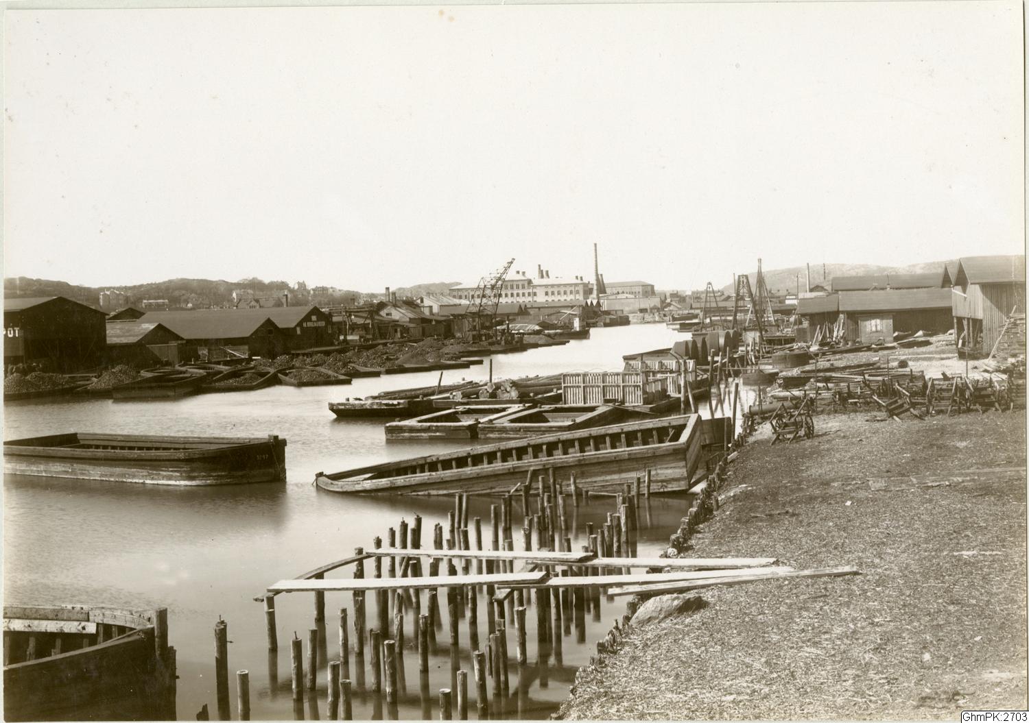 Kvillebäckskanalen, blick mot norr. I bakgrunden Göteborgs Porslinsfabrik.